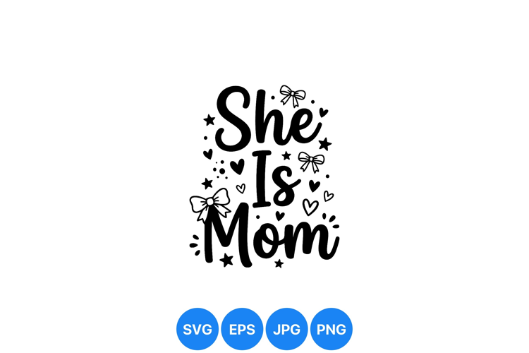Hand lettering design with the phrase she is mom decorated with hearts stars and bow illustrations in black and white style suitable for mother themed projects elegant and simple