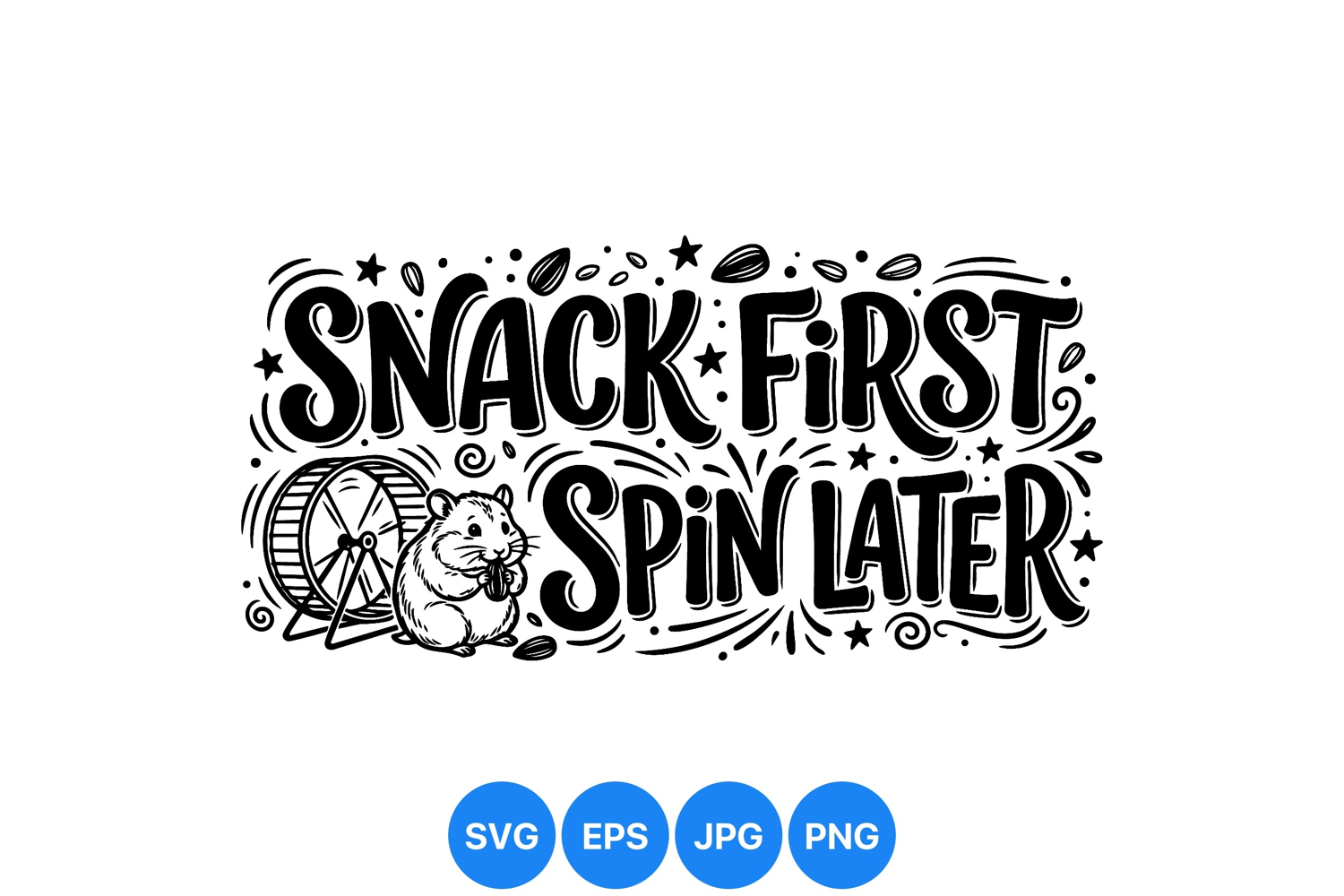 Whimsical black and white vector art featuring a cute hamster eating seeds next to a wheel with decorative text saying snack first spin later in playful style suitable for pet lovers
