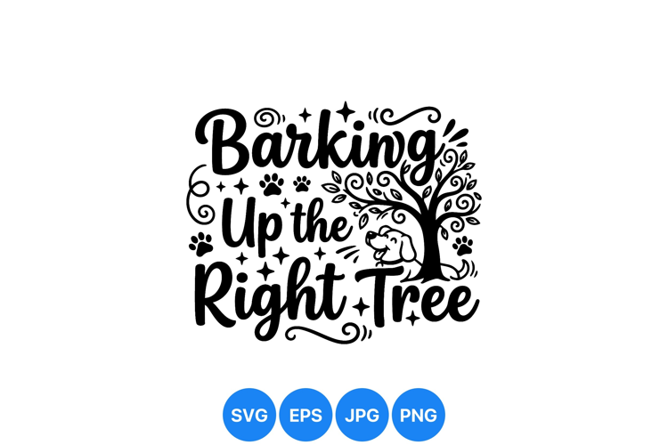 Playful black and white vector art shows barking up the right tree phrase with happy dog and swirling leaves decoration for fun pet or dog lover designs and posters lively mood