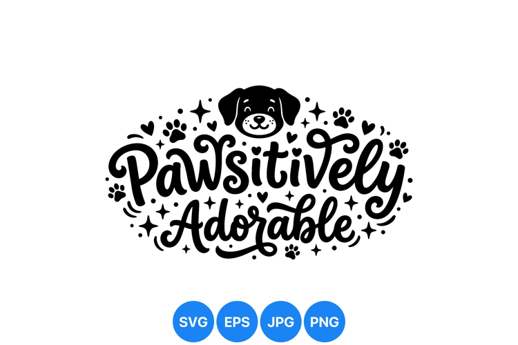 Adorable hand lettered phrase pawsitively adorable surrounded by smiling dog face paw prints hearts and sparkles in simple black and white style conveying positive pet vibes joyful mood