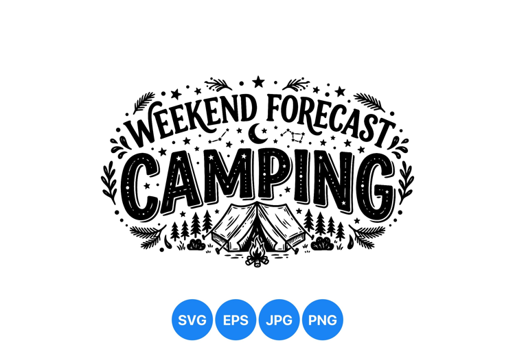 Hand drawn vintage style vector design featuring weekend forecast camping text with a tent pine trees and campfire surrounded by stars and decorative elements in black and white