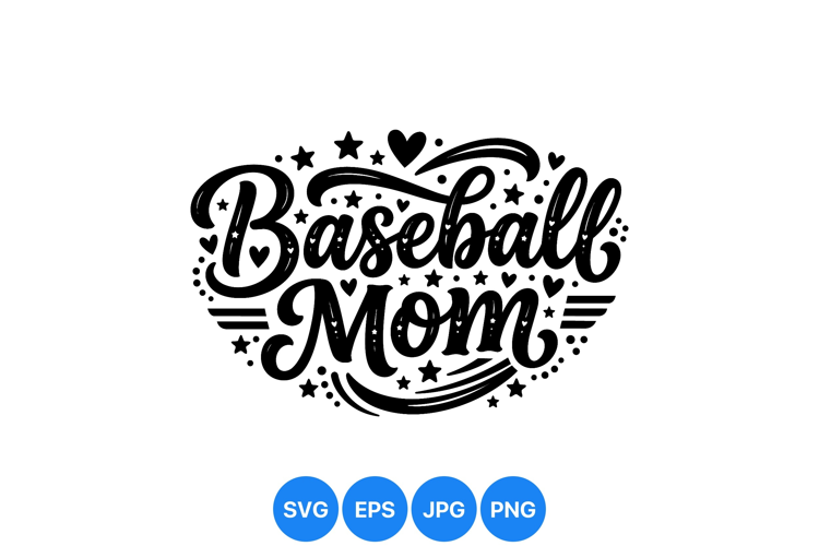 Elegant black and white hand lettering design spells out baseball mom surrounded by stars hearts and swirling decorative elements in a stylish vector illustration perfect for apparel and print uses