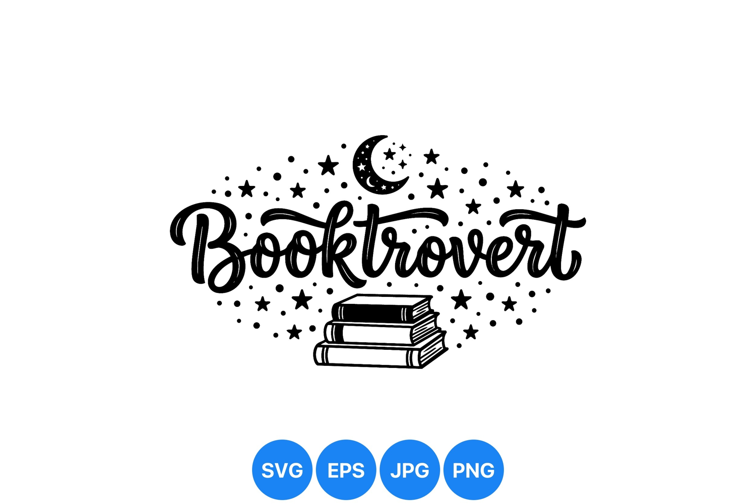 Elegant hand lettering spells booktrovert with stacked books below a crescent moon surrounded by stars in a black and white minimalist style emphasizing reading and nighttime calm mood