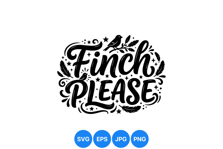 Playful black and white hand lettering says finch please surrounded by decorative feathers stars and a small bird creating a charming whimsical design