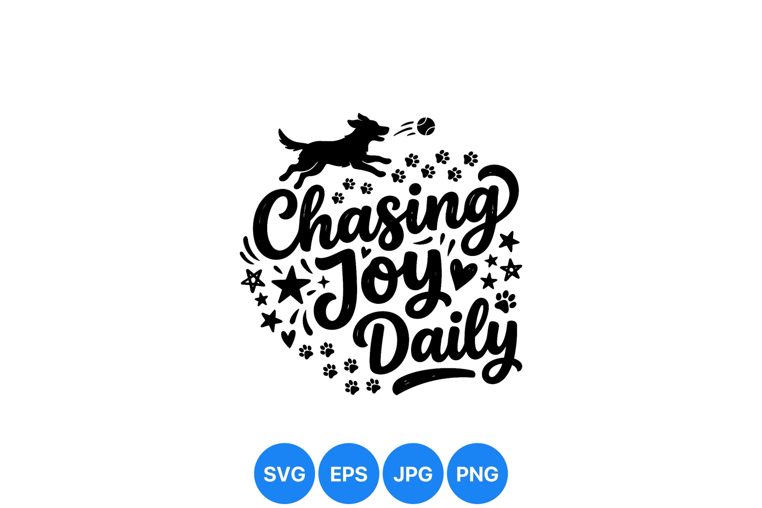 Playful vector art shows a dog silhouette chasing a ball above hand lettered phrase chasing joy daily surrounded by stars paw prints and hearts emphasizing happiness and activity