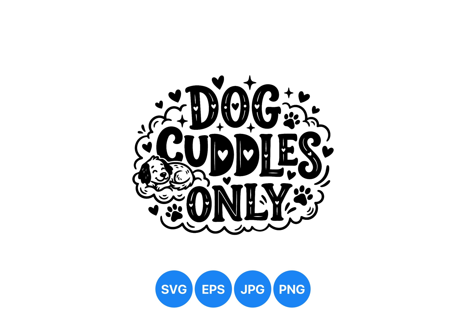 Black and white vector art showing a sleeping cute puppy surrounded by hearts and paw prints with the phrase dog cuddles only in playful lettering conveying warmth and comfort.