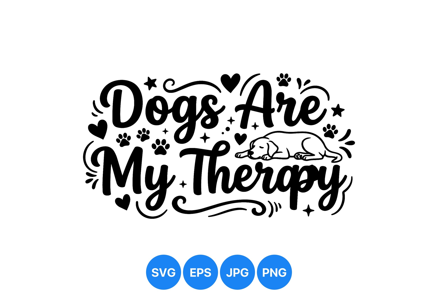 Hand lettering design stating dogs are my therapy with a sleeping dog and decorative paw prints and hearts in black and white vector style peaceful mood