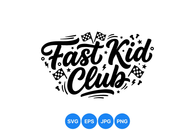 Bold black lettering spells out fast kid club surrounded by racing flags stars and dynamic motion lines in a playful vector style creating energetic fun vibe