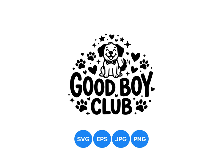 Playful vector illustration shows a happy dog wearing a bow tie sitting above good boy club text with paw prints hearts and stars surrounding it in black and white style