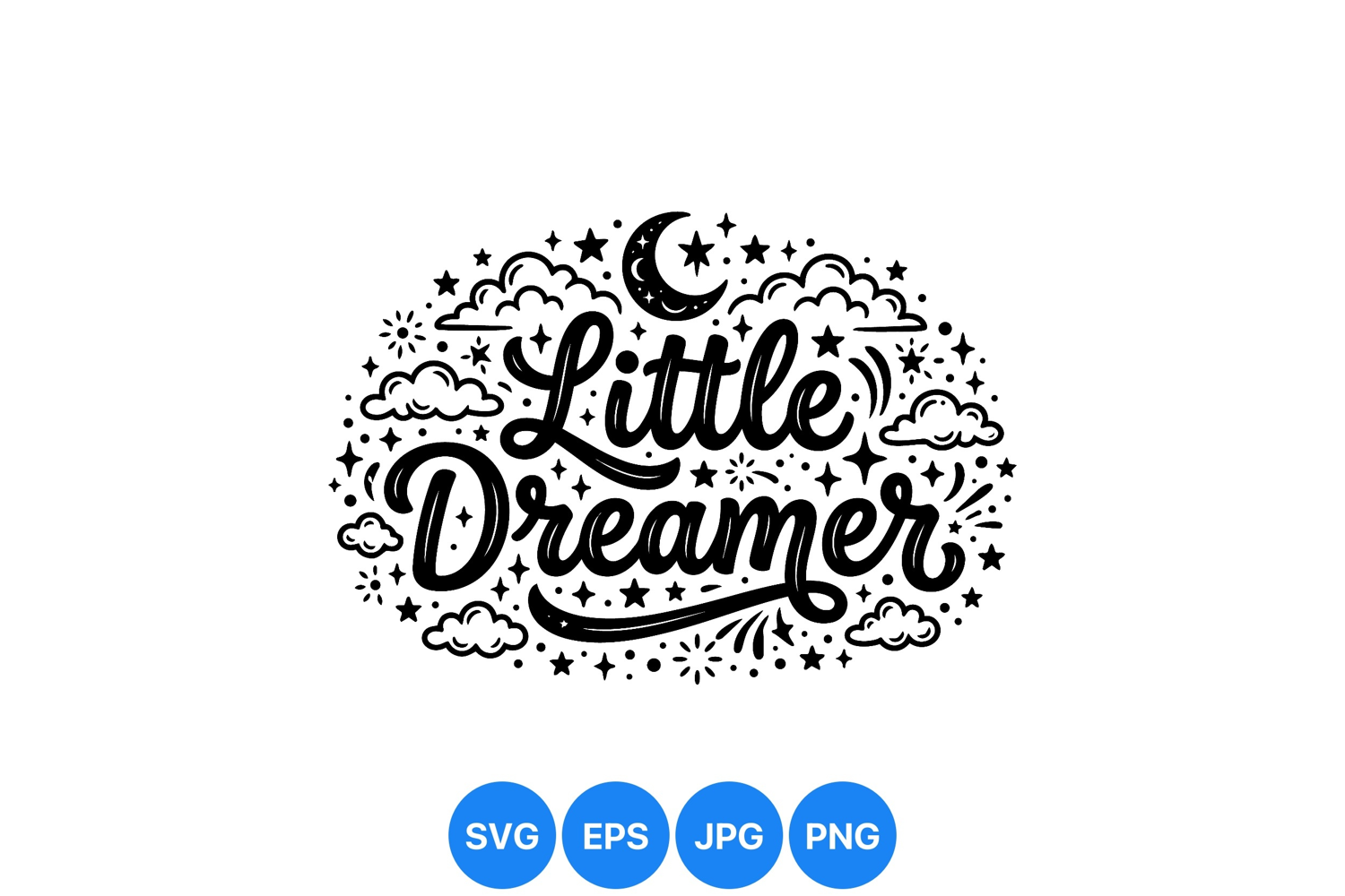 Hand drawn black and white lettering spells out little dreamer with decorative stars clouds and crescent moon in whimsical vector style for creative inspirational use