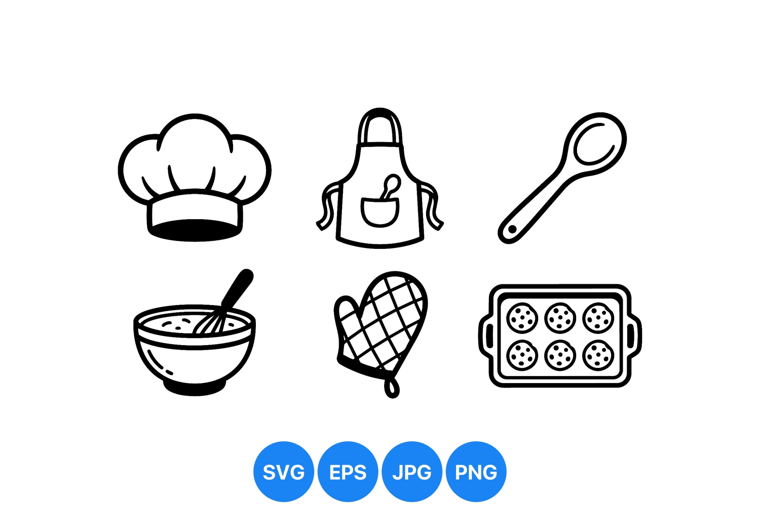 Black and white vector icons include chef hat apron spoon mixing bowl with whisk oven mitt and cookie tray with six cookies providing cooking and baking symbols in a clean style