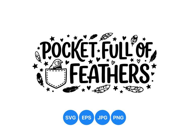 Bold black lettering spells pocket full of feathers with a bird peeking from a stitched pocket and decorative feather stars and hearts surrounding the text playful design