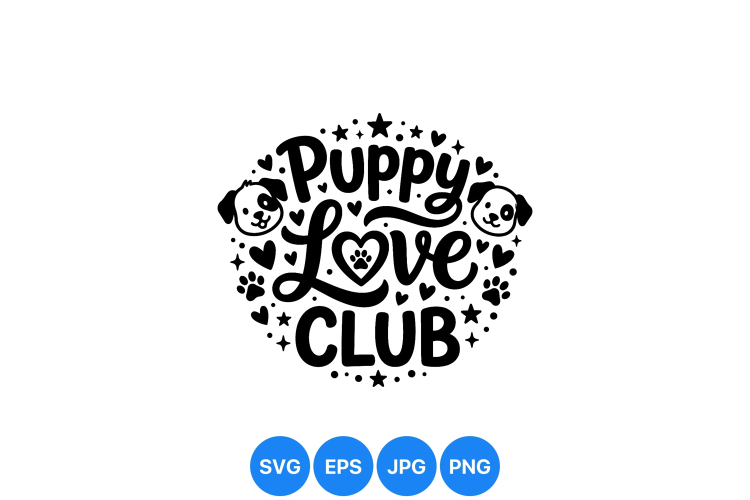 Playful black and white vector art featuring puppy love club typography surrounded by dog faces hearts paw prints and stars in a circular layout friendly and charming.