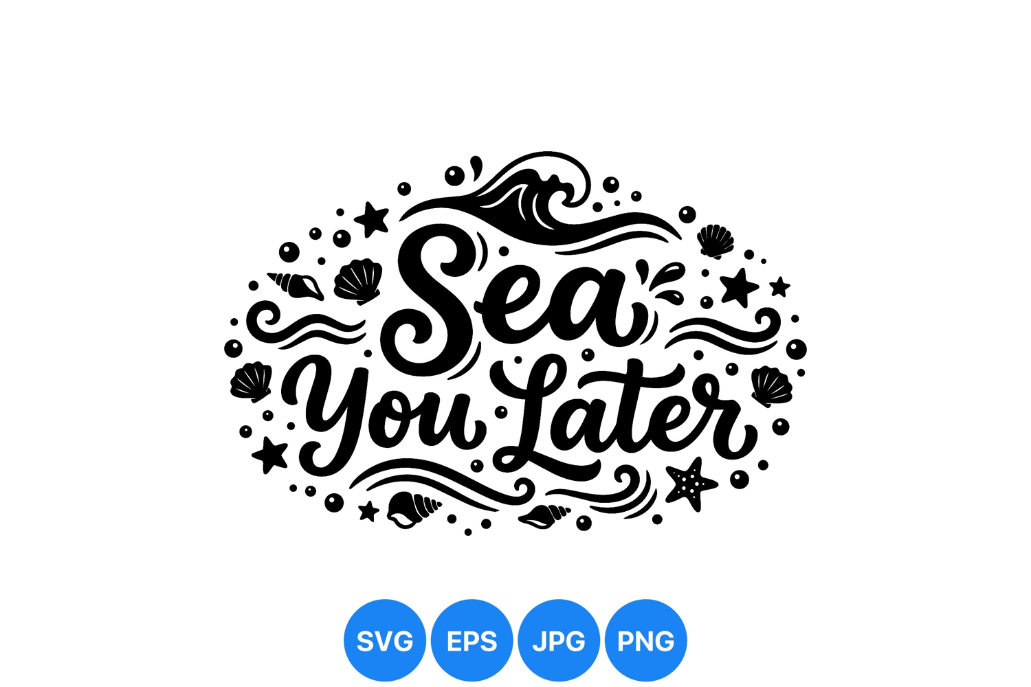 A black and white hand lettered design featuring the phrase sea you later surrounded by wave shapes shells and starfish in a playful nautical style perfect for summer themes or greeting cards