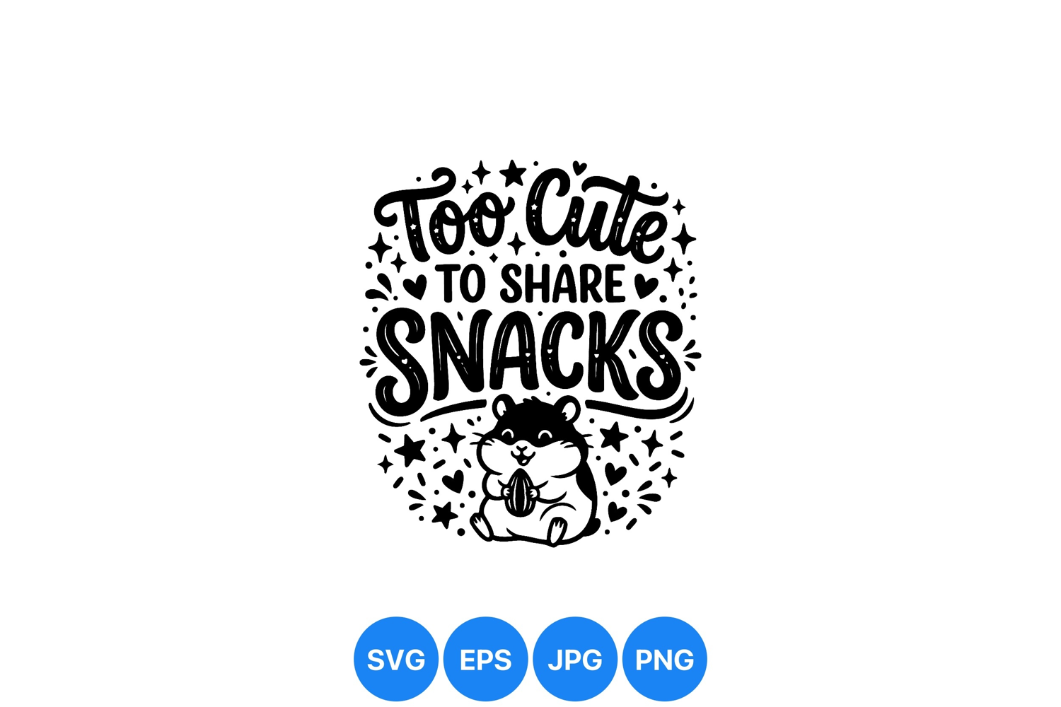 Playful black and white vector illustration featuring a cute hamster holding a seed with whimsical lettering saying too cute to share snacks framed by hearts stars and sparkles