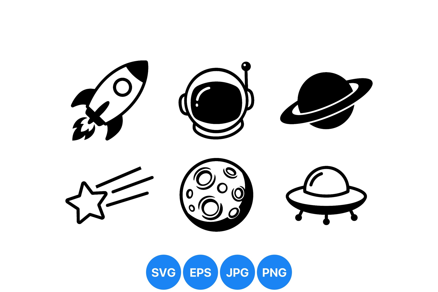 of black and white space themed icons featuring a rocket ship launching helmet with antenna planet with rings shooting star moon with craters and classic flying saucer spaceship designs minimalist and bold style