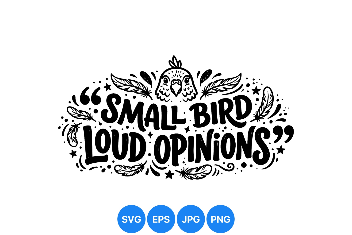 Playful hand lettering displays the phrase small bird loud opinions surrounded by feather illustrations and star icons in monochrome style for creative quote designs or social media
