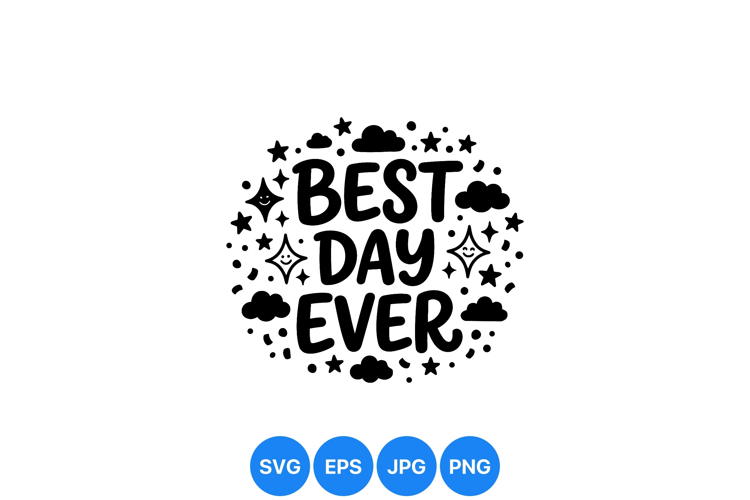 Playful hand drawn typography spelling best day ever surrounded by happy stars clouds and dots creating a cheerful positive mood design
