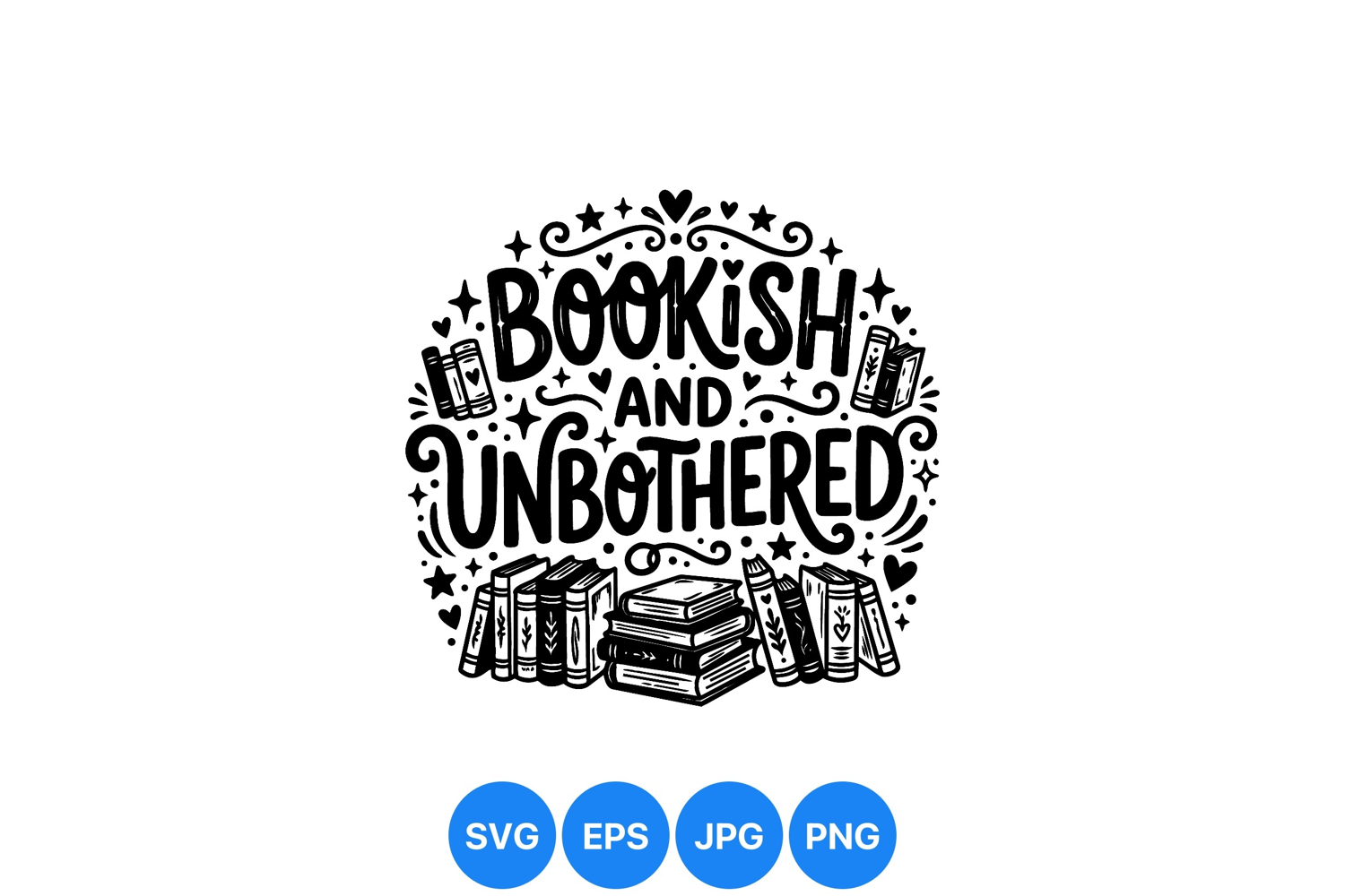 Hand drawn black and white typography featuring the phrase bookish and unbothered surrounded by stacks of books stars hearts and decorative swirls in monochrome style