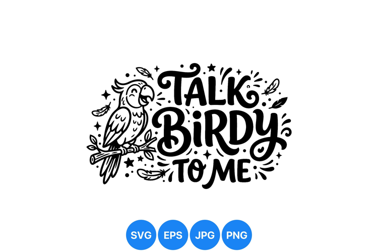 A charming black and white vector design featuring a smiling parrot perched on a branch with playful lettering talk birdy to me surrounded by decorative feathers and stars