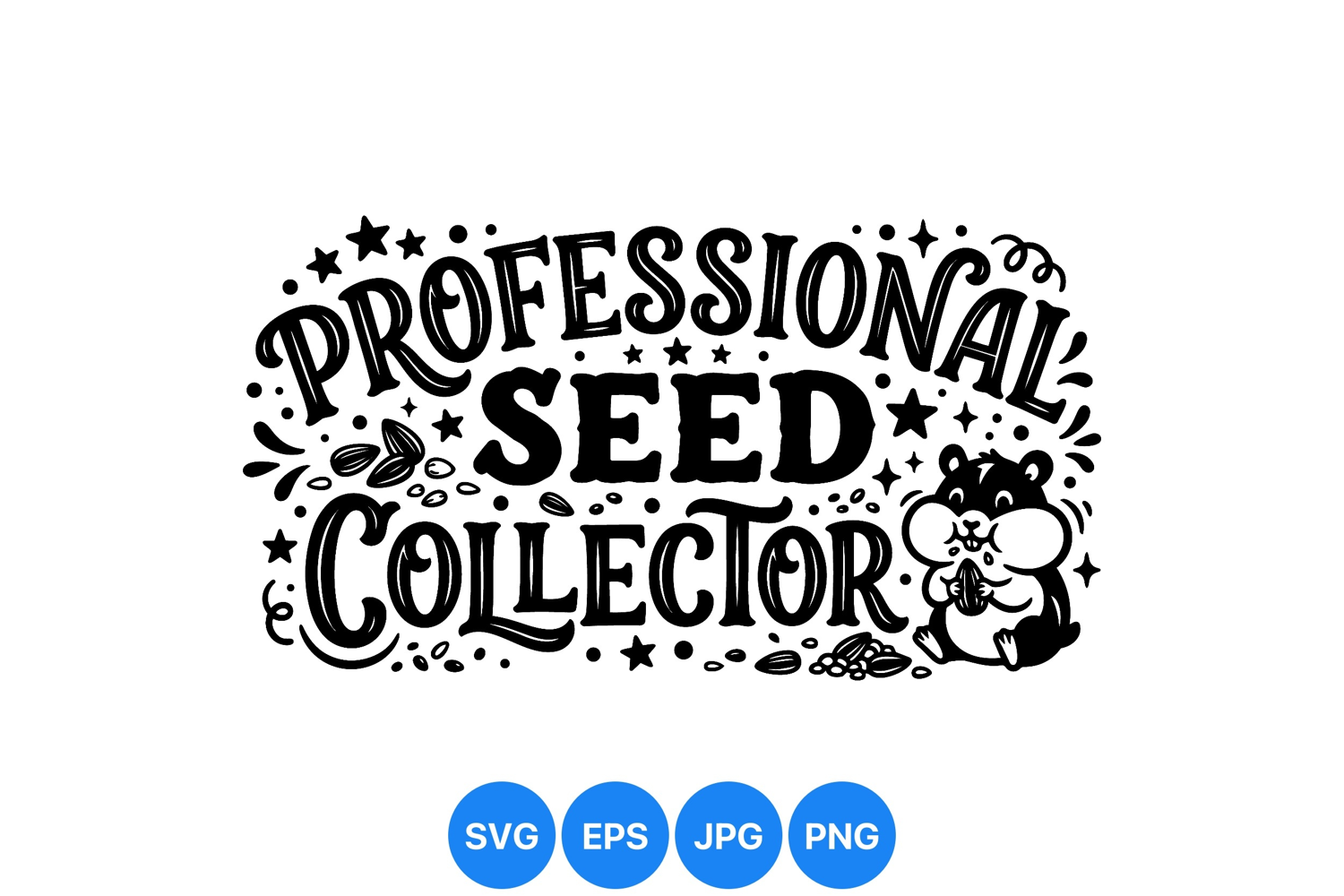 Black and white vector art of a chubby hamster holding sunflower seeds surrounded by stars and seed elements with playful typography saying professional seed collector fun design