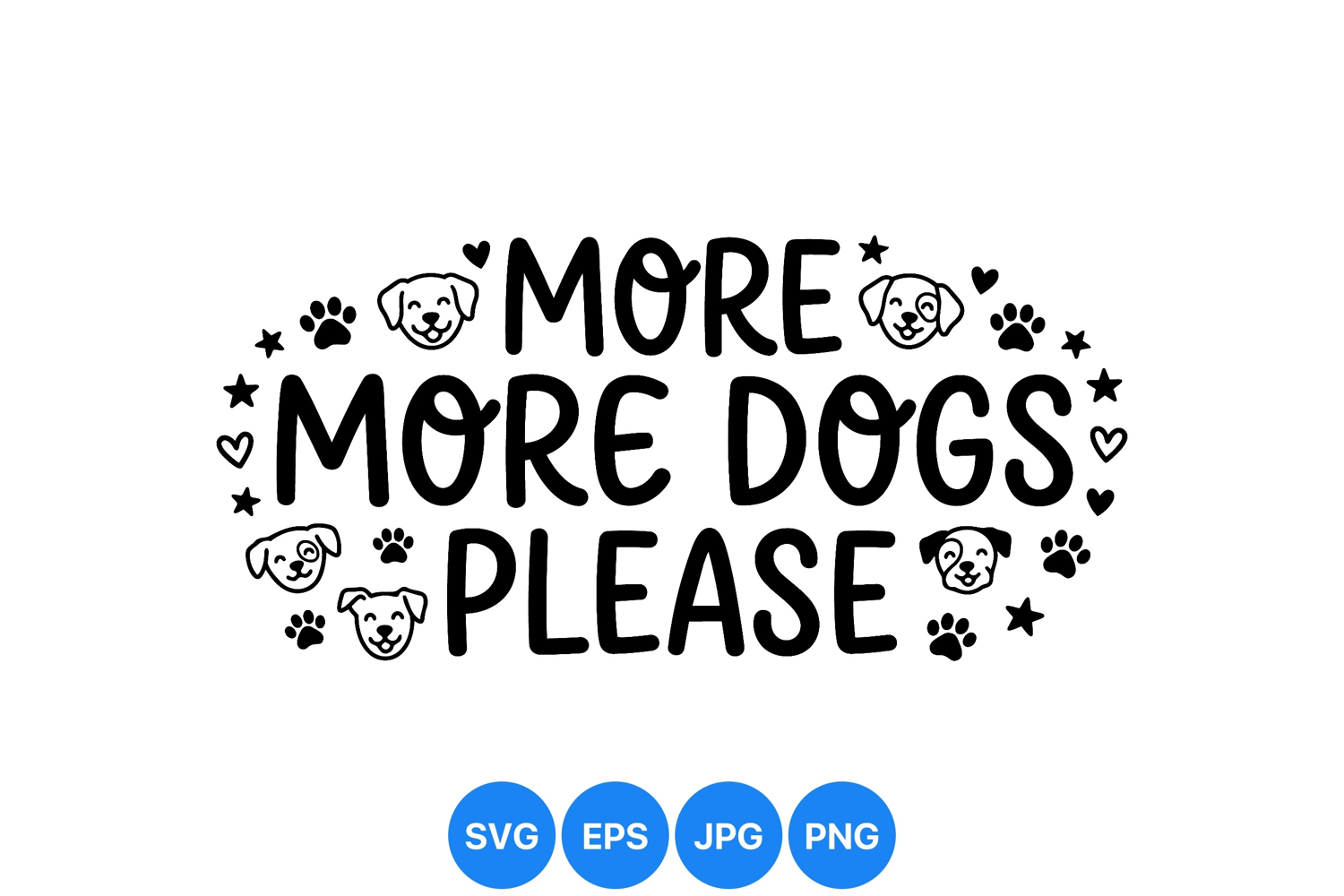 Playful black and white vector design with handwritten style text more more dogs please surrounded by cute dog faces paw prints hearts and stars for animal lovers fun