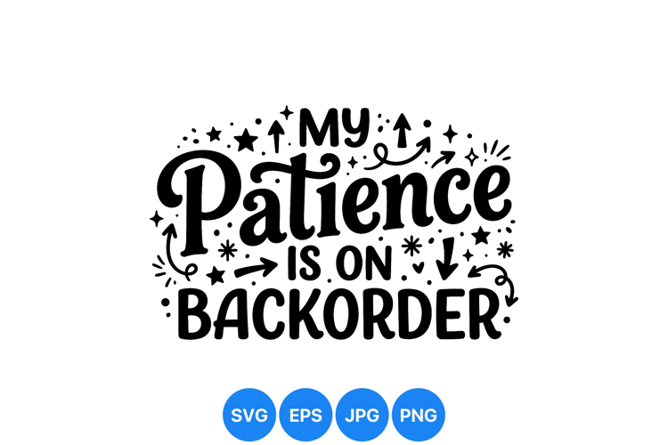 Hand lettering typography stating my patience is on backorder surrounded by arrows stars and dots in black and white vector style suitable for motivational and humorous design projects