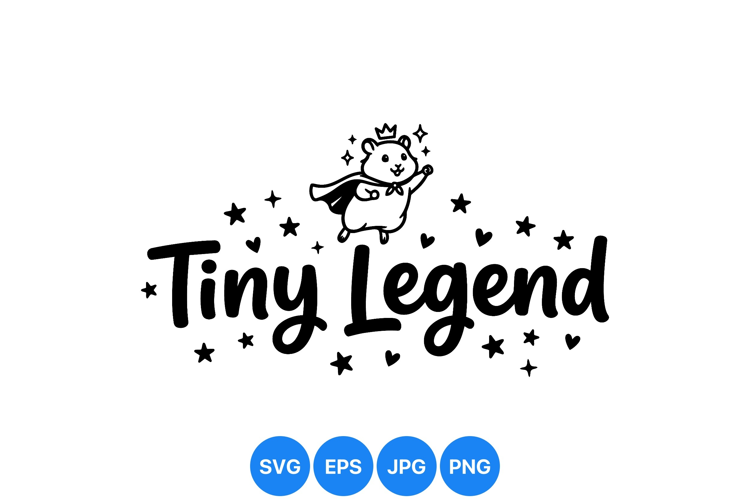 A charming illustration of a small heroic hamster wearing a cape and crown flying above playful stars and hearts with the phrase tiny legend in bold script style