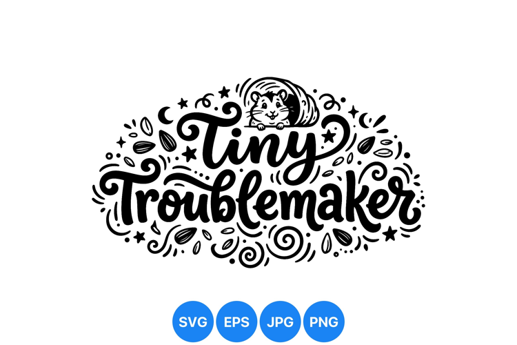 Hand lettering phrase tiny troublemaker with a small hamster peeking out of a wheel surrounded by playful decorative elements in black and white vector style vibrant energetic design
