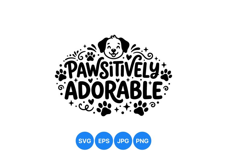 Hand drawn black and white vector design shows a happy dog face above playful pawsitively adorable typography surrounded by paw prints and decorative swirls for pet lover themes