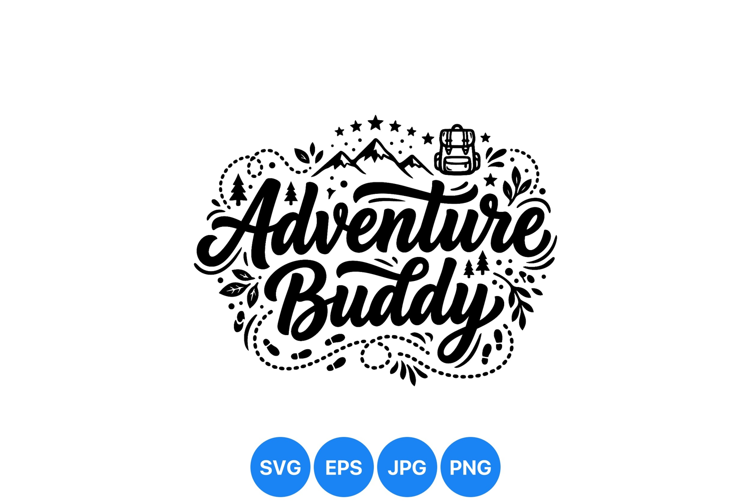 Bold hand lettering spells adventure buddy surrounded by mountain peaks backpack footprints and foliage in a decorative vector style suitable for outdoor branding and apparel designs vibrant and dynamic