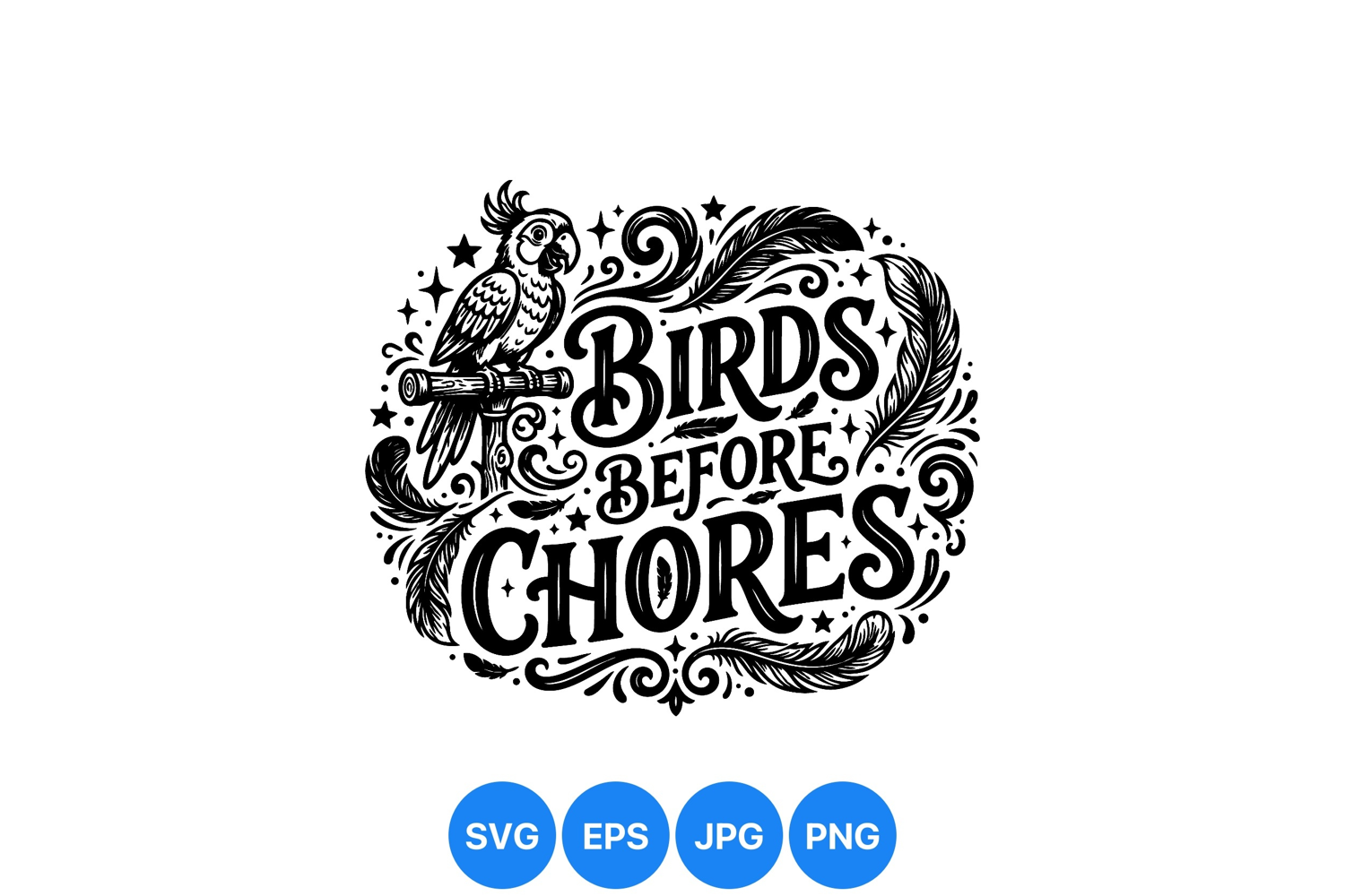 Intricate black and white vintage style vector art featuring a parrot perched on wood with decorative feathers stars and swirling patterns surrounding birds before chores text elegant design.