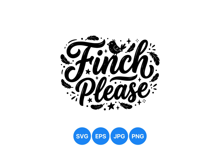 Elegant black calligraphy text finch please is surrounded by a small bird silhouette feathers stars and dots in a stylish vector design perfect for print or web usage.