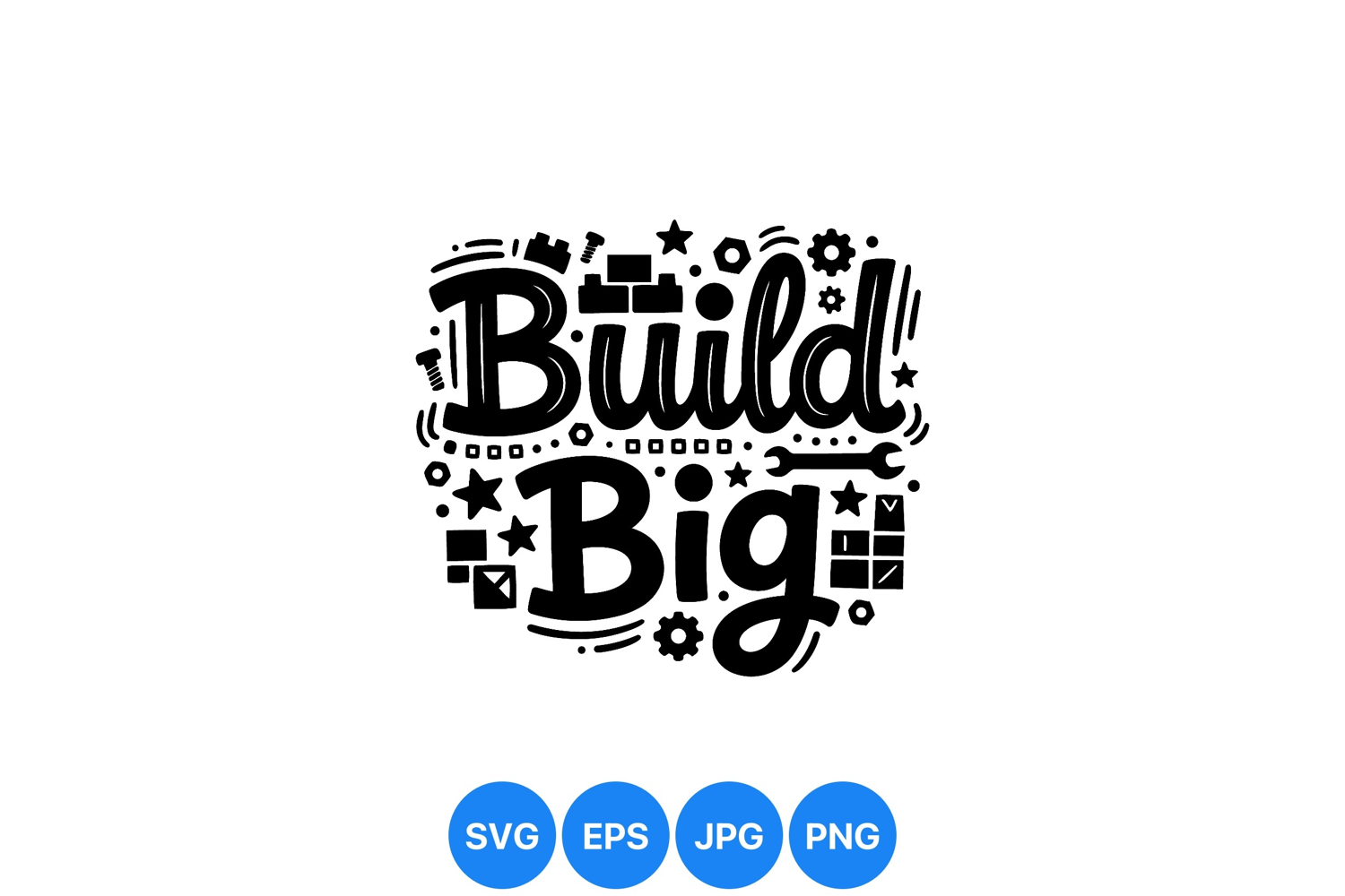 Black and white hand lettering design spelling build big surrounded by construction icons such as bricks wrench screws and gears in bold style with playful and creative mood
