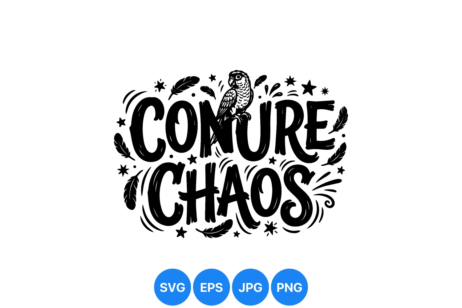 Black and white vector design featuring a conure bird perched on whimsical chaotic lettering with decorative feathers and stars creating a lively, artistic composition in monochrome style