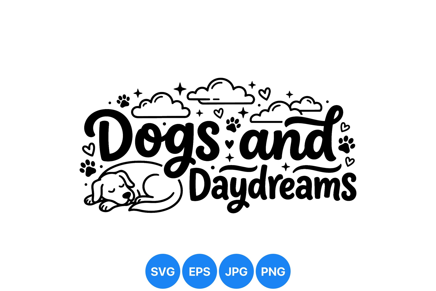 Hand drawn vector design featuring playful lettering dogs and daydreams with a sleeping dog surrounded by clouds paw prints hearts and stars minimal black and white style suitable for apparel or print usage peaceful mood