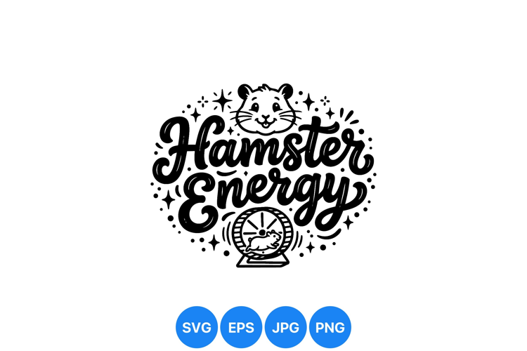 Playful hand drawn script combines with a cute hamster face and lively running wheel graphic surrounded by decorative stars and dots in monochrome vector style