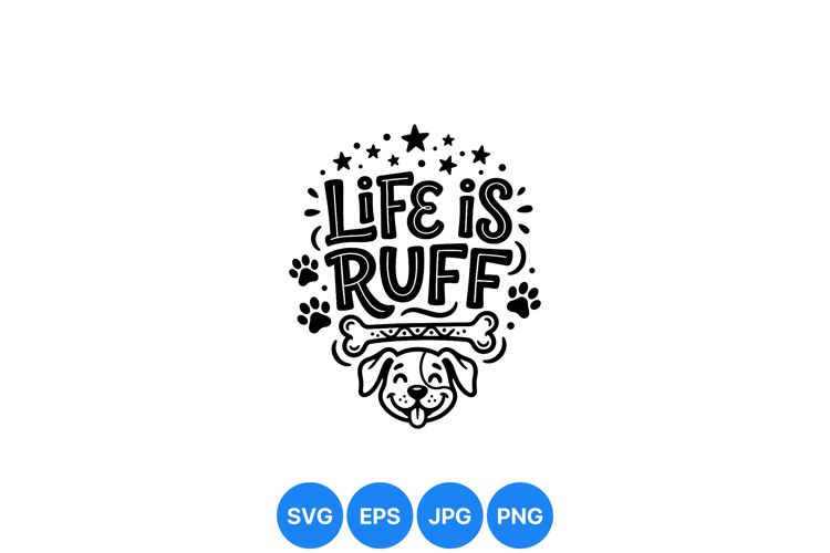 A playful black and white vector graphic shows a happy dog face with tongue out below the quote life is ruff surrounded by paw prints and stars in adorable style.