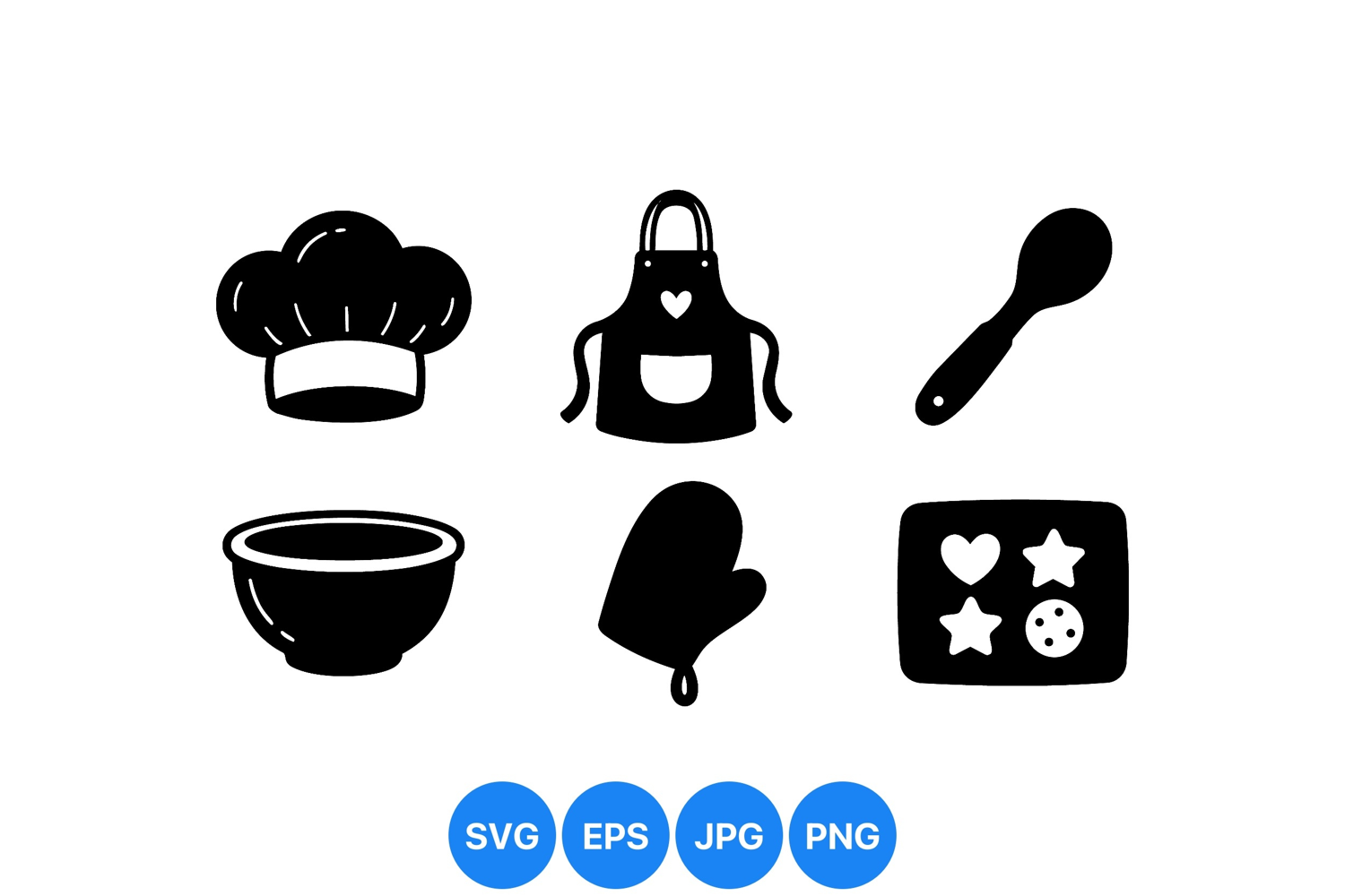 Black silhouette style vector art showing essential kitchen baking tools including chef hat, apron, bowl, oven mitt, spoon, and cookie cutter shapes with a clean design aesthetic
