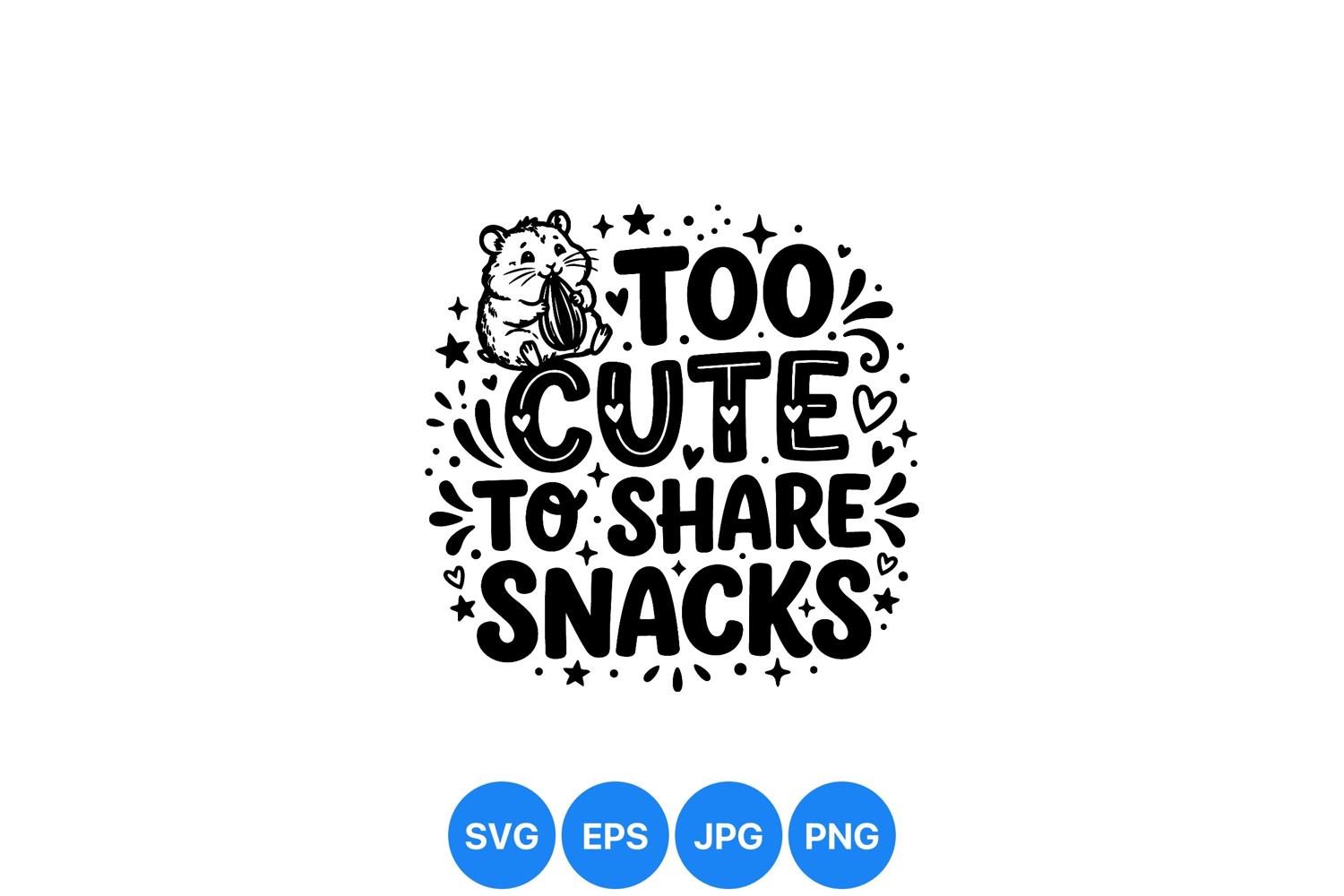 A charming black and white vector illustration of a hamster eating a sunflower seed accompanied by playful lettering saying too cute to share snacks in a whimsical style.