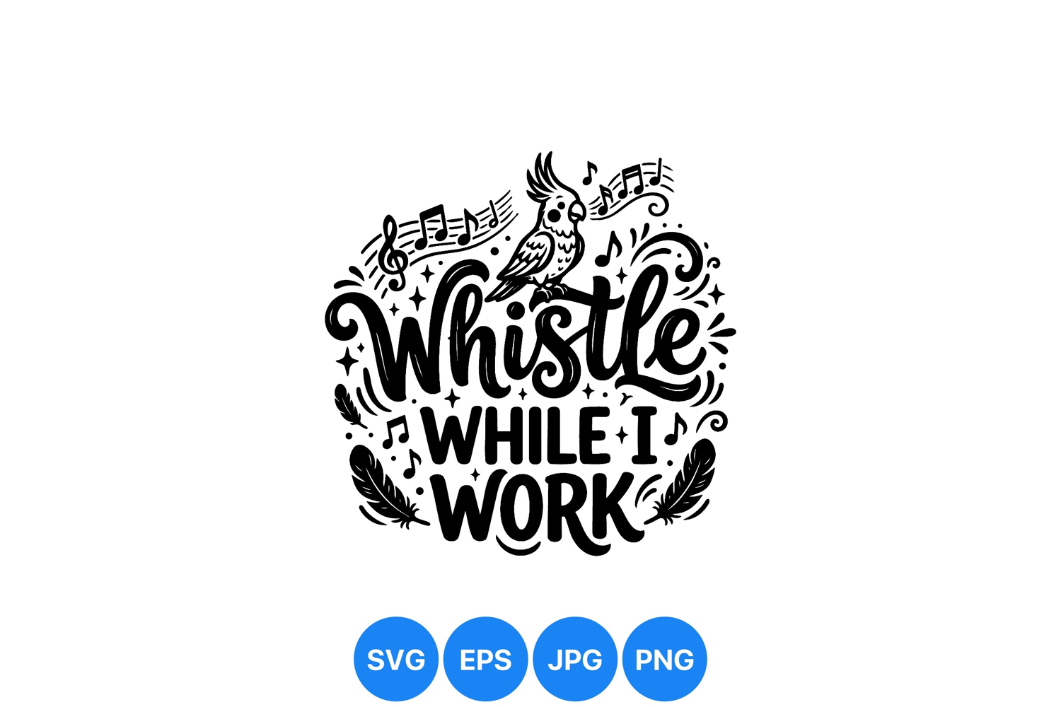 Creative black and white vector art featuring hand lettered phrase whistle while i work with a singing bird and musical notes surrounded by decorative feathers and swirls lively mood