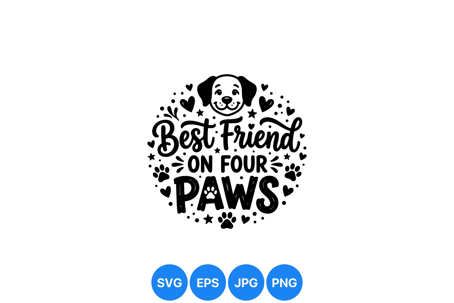 Playful black and white illustration featuring a happy dog face with hearts and paw prints decorating the text best friend on four paws in a whimsical style