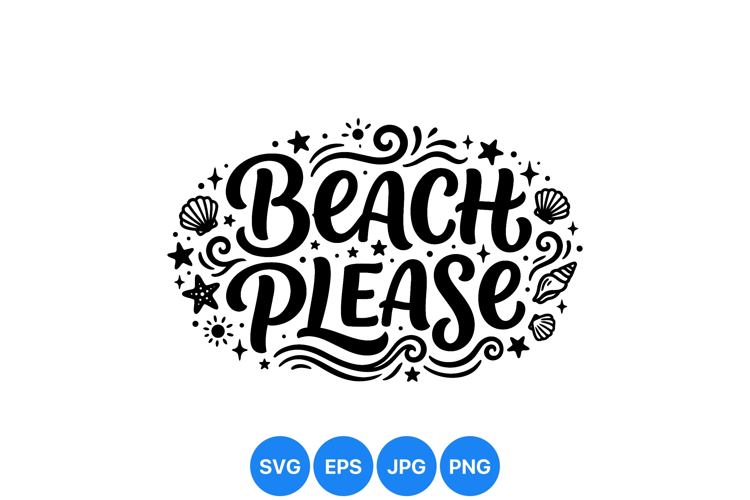 Black hand lettering saying beach please surrounded by seashells stars waves and decorative marine elements in vector art style for summer vacation and seaside themes peaceful vibe