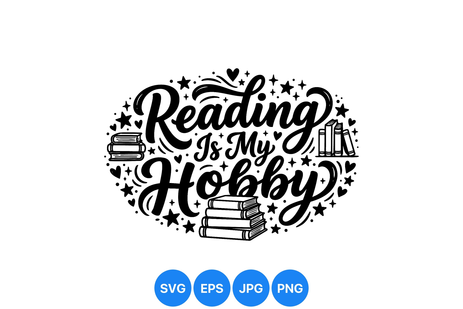 Hand lettered phrase reading is my hobby surrounded by illustrated stacks of books hearts and stars in a black and white vector style perfect for book lovers and hobby designs