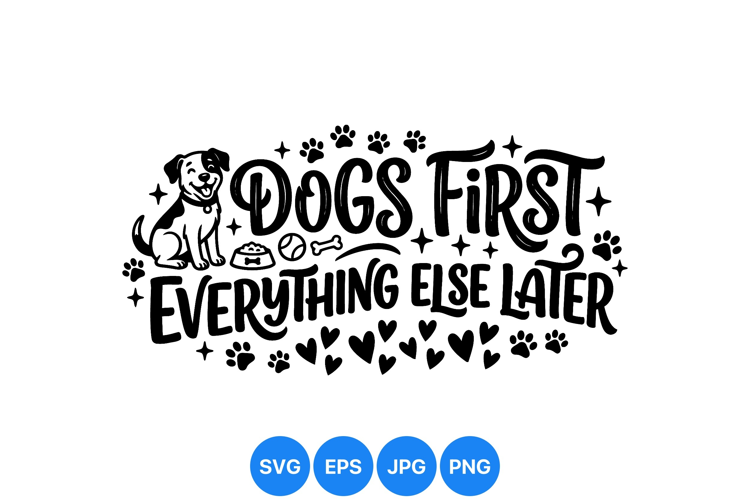 Playful vector art shows a happy dog with paw prints and hearts around bold lettering saying dogs first everything else later in black and white design.
