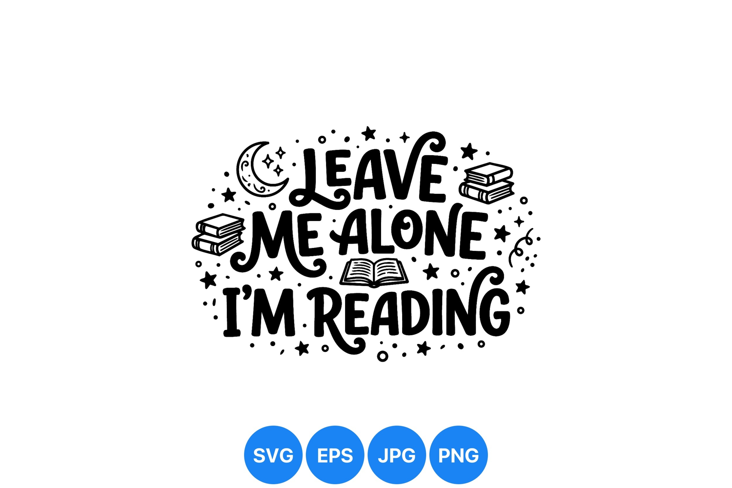 Hand drawn black and white lettering saying leave me alone i am reading surrounded by books stars and crescent moon for readers and book lovers calm design
