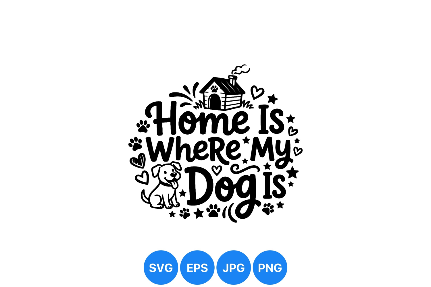 Black and white vector artwork featuring the phrase home is where my dog is surrounded by stars hearts paw prints dog house with smoke playful loving design suitable for pet lovers