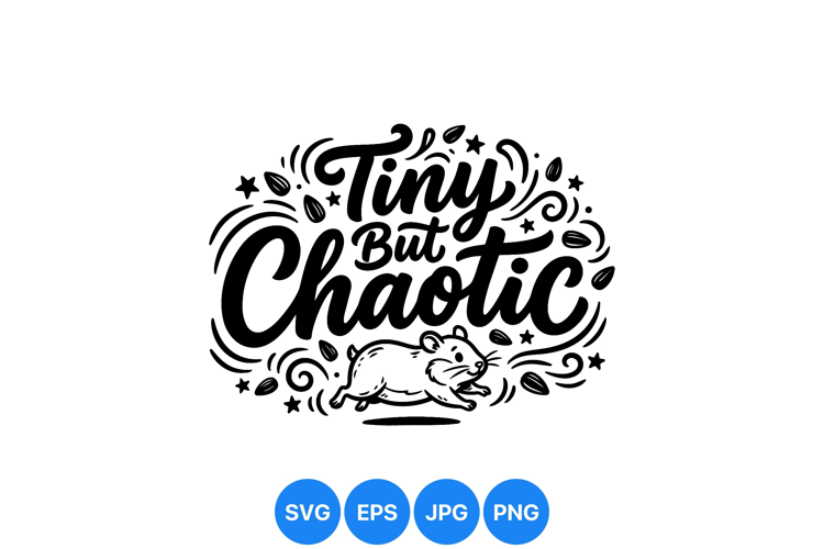 A playful hand lettered phrase tiny but chaotic combines with a dynamic running hamster and decorative seeds and stars in minimalist black and white vector style with a lively mood