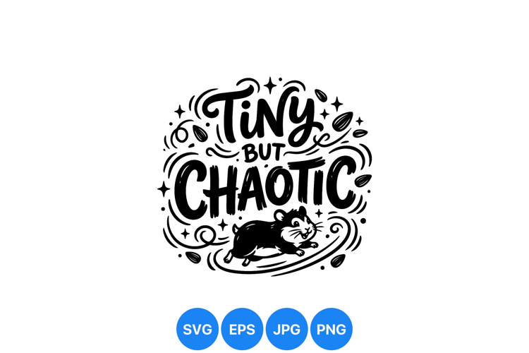 Whimsical black and white vector art displays the phrase tiny but chaotic with a running happy hamster surrounded by swirling lines and seeds in playful doodle style