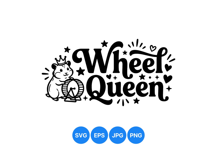 Whimsical black and white vector art of a smiling hamster wearing a crown next to an exercise wheel with decorative stars and hearts surrounding playful word lettering wheel queen.